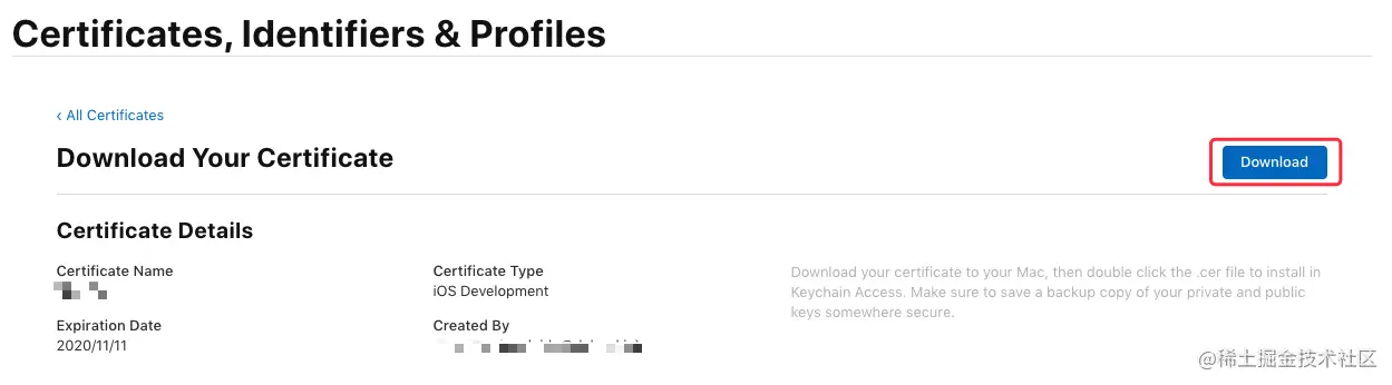 生成证书后选择 “Download” 将证书下到本地 (ios_development.cer):