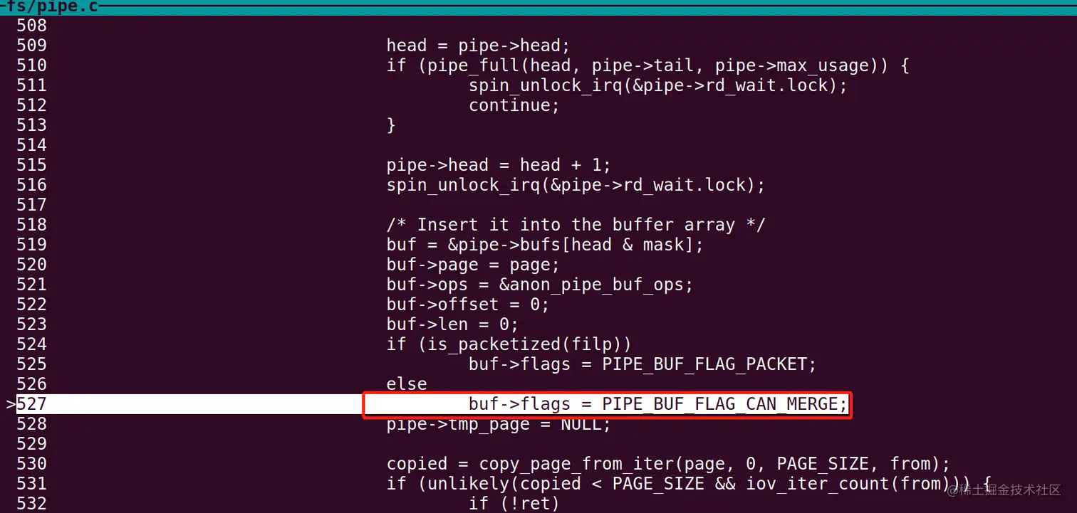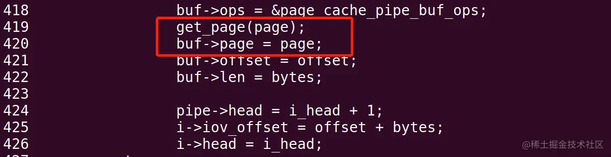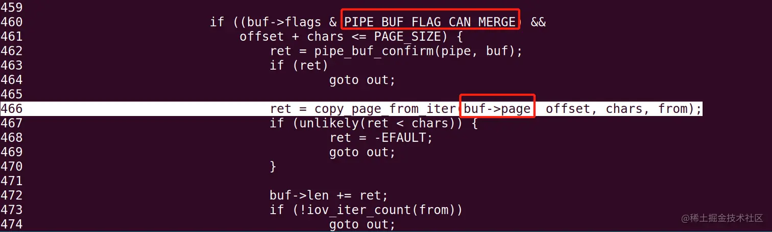 后面则到达了漏洞发生的代码,由于我们使用splice函数进行数据的移动,在内核中不是选择将数据直接从文件中拷贝到管道中,而是将文件所在的物理页直接赋值给管道缓冲区所对应的页面。