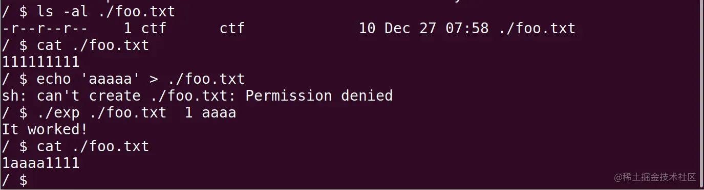 首先创建一个只读文件foo.txt,并且正常情况下是无法修改该可读文件,但是利用了DirtyPipe漏洞后发现可以将字符aaaa写入到只读文件中