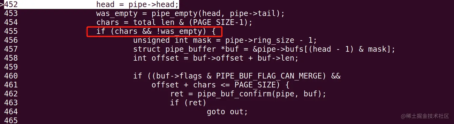 由于已经通过splice函数移动数据到管道缓冲区古内部了,因此管道不为空会进入到455行的内部处理逻辑