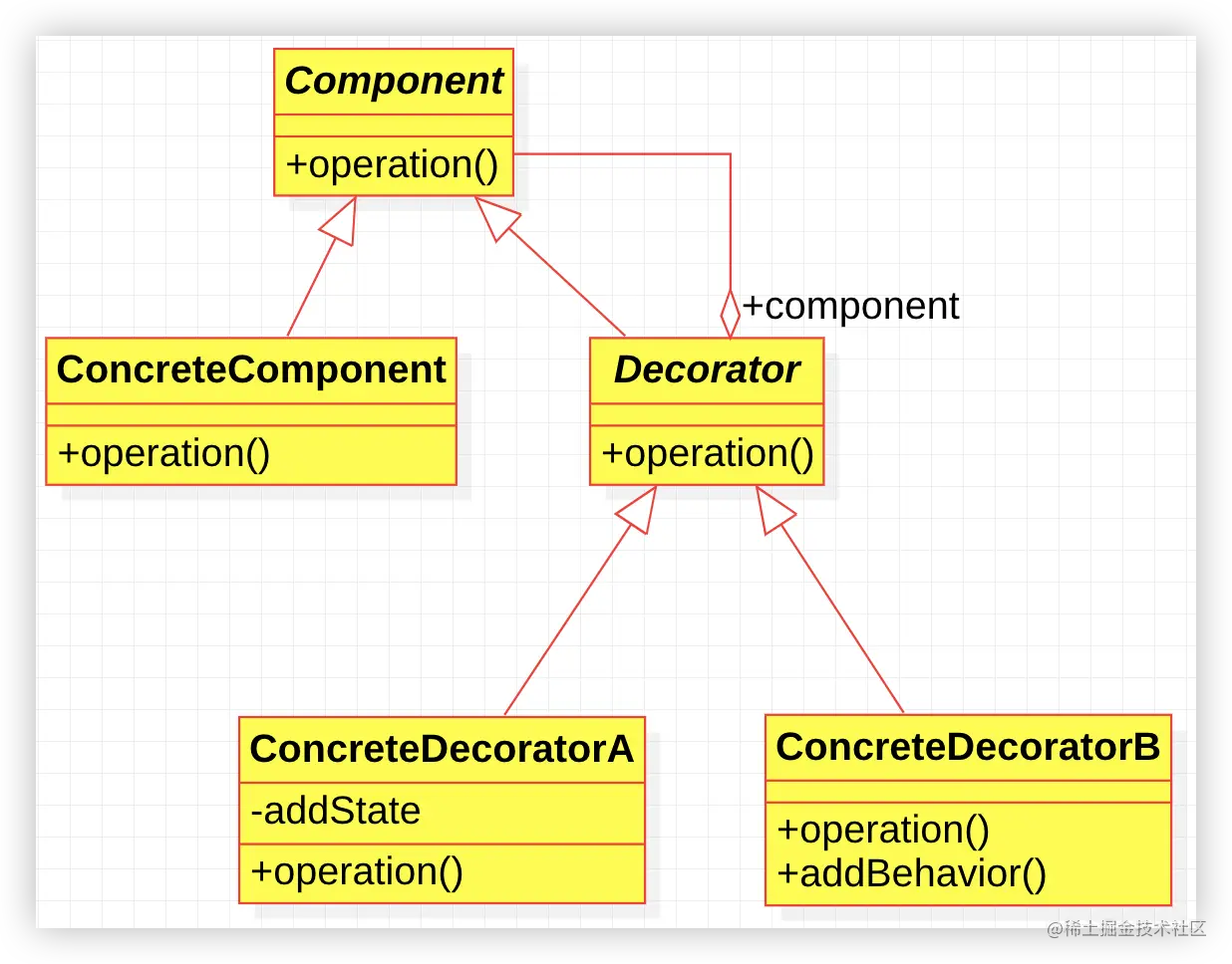- Component是一个接口或者是抽象类,用于定义需要被装饰的核心类