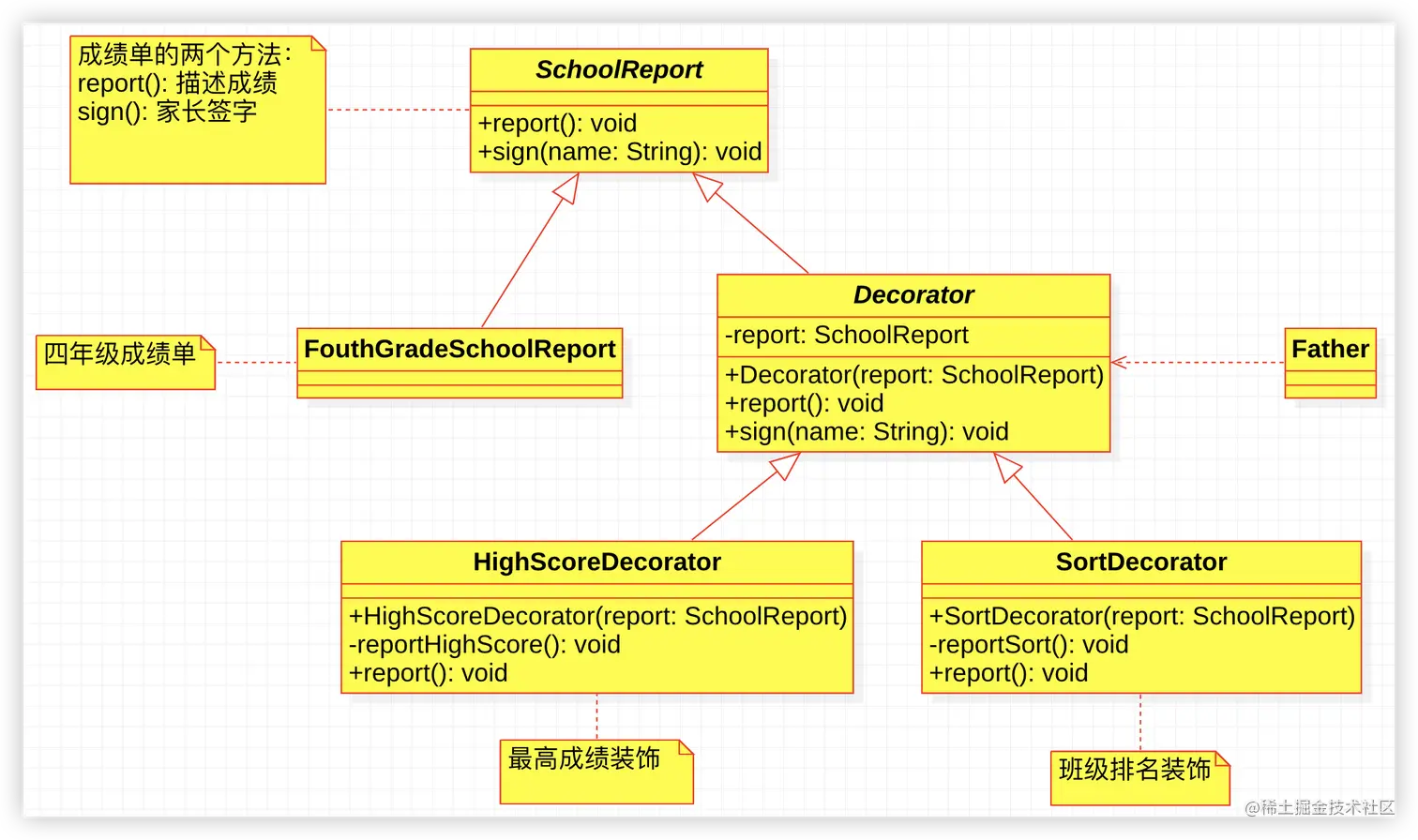 - 如果继续对SugarFouthGradeSchoolReport类进行装饰,则需要开发其子类,导致类的继承层数过多