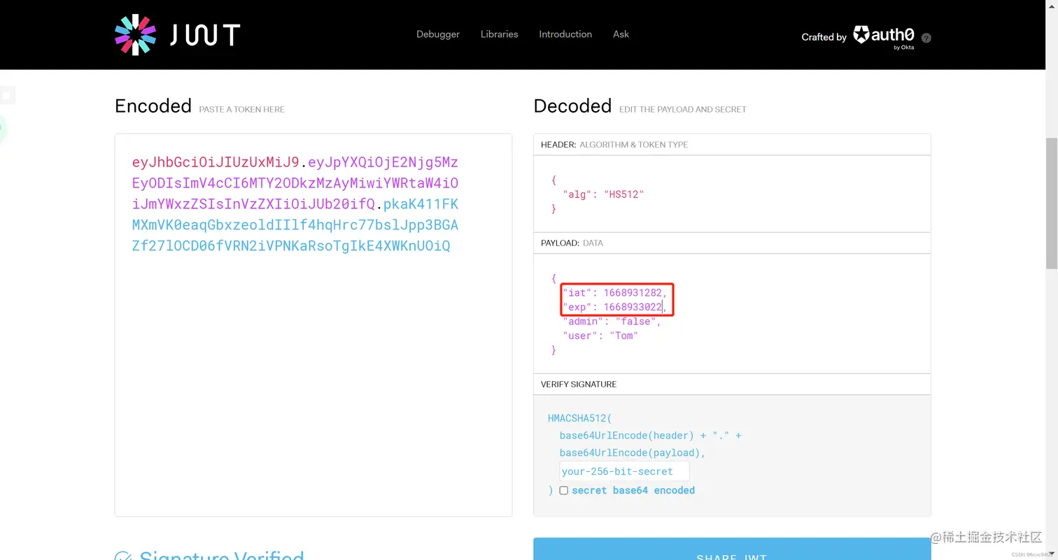 可以在官网上进行解密查看内容:JSON Web Tokens - jwt.io
