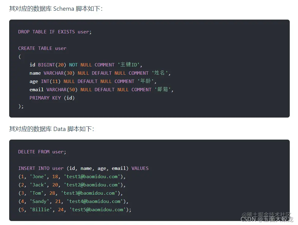 VALUES(1, 'Jone', 18, 'test1@baomidou.com'),