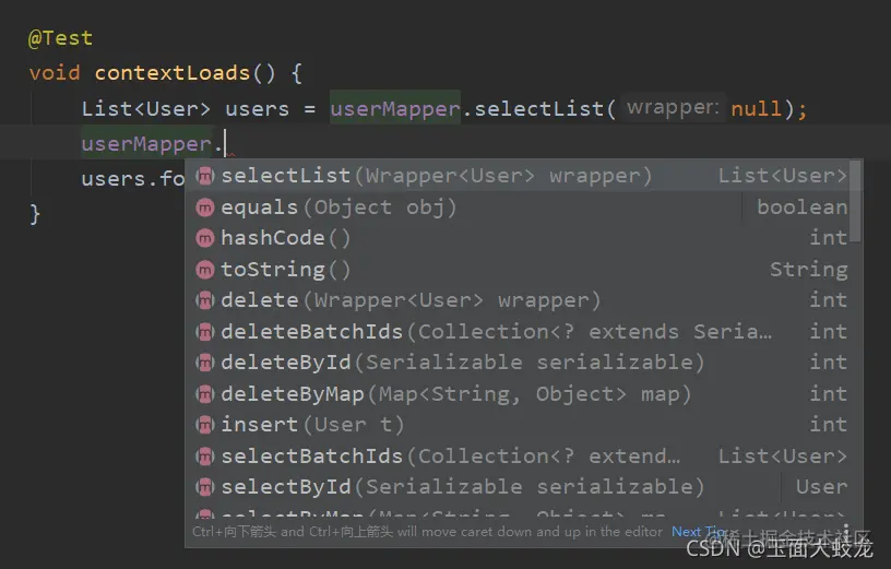 在测试类中自动注入userMapper,其实,在代码提示中,我们就已经能看出,许多CRUD方法已经全部在里面了