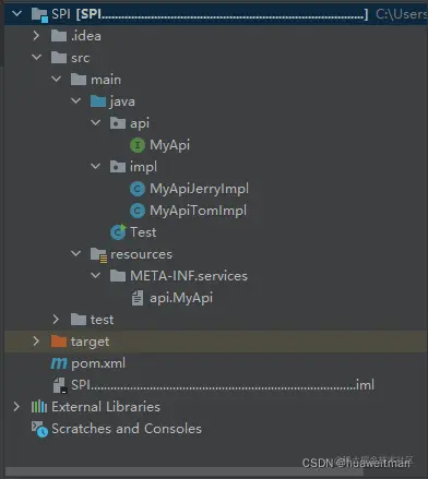 通过SPI的方式,第三方服务模块实现接口后,在第三方的项目代码的META-INF/services目录下的配置文件指定实现类的全路径名,源码框架即可找到实现类。