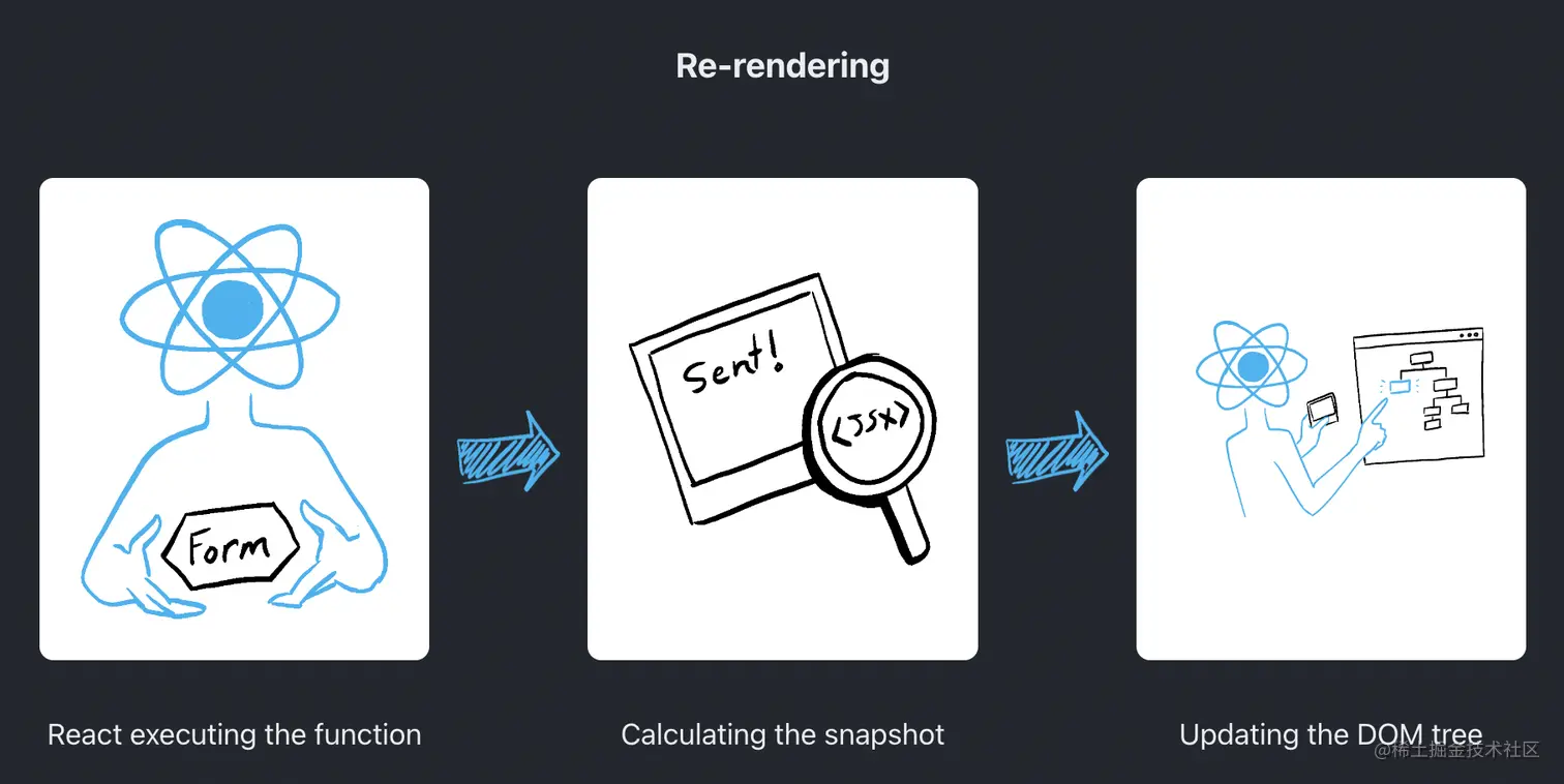 ‘Rendering’就是react函数调用你定义的组件,其返回值(你写的JSX)就是关于UI的快照,在render时使用组件内的状态(props 事件控制器 组件内变量)。但是这里的UI快照是响应式的,它会包含一些逻辑,比如当输入时会触发一些特定的事件,react会根据快照的数据去更新UI以达到匹配的目的。所以当 react重新渲染一个组件时,主要流程是:1. react去重新调用定义的函数;2. 函数返回一个新的JSX快照;3. react根据返回的快照更新UI,如下图。