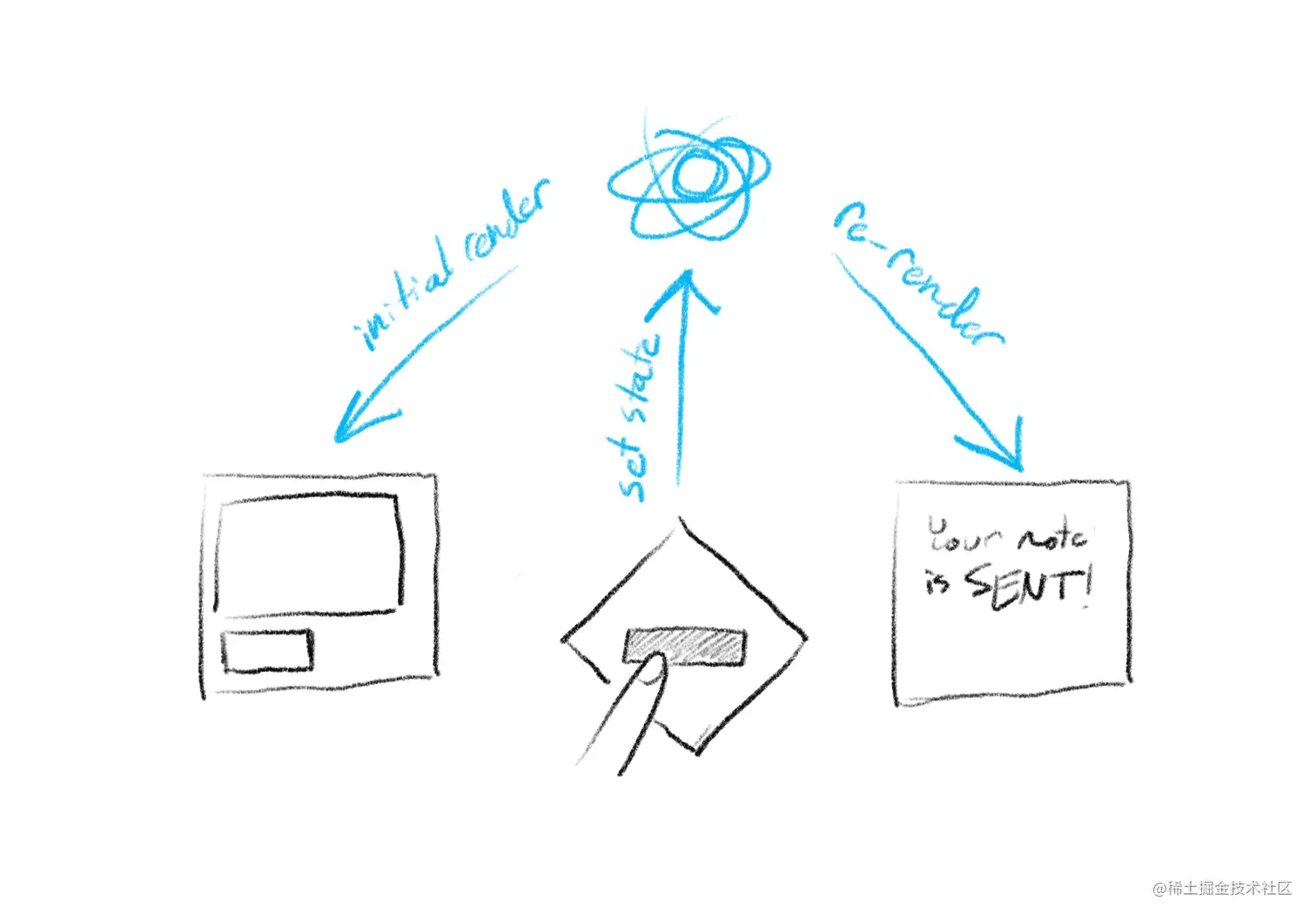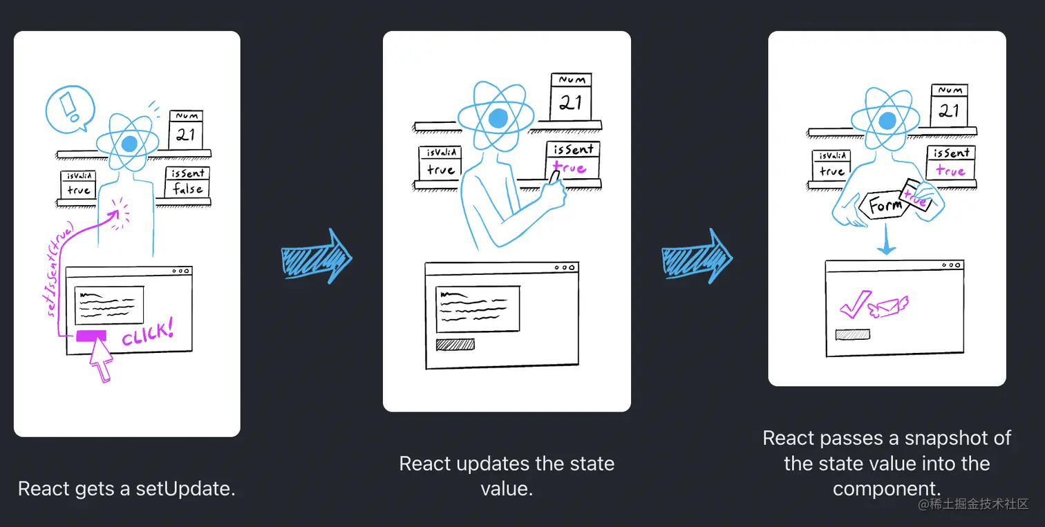 组件内的state同普通函数内的变量不同,它不会在函数执行结束后销毁,它会在react中继续存在(就像是在架子上的一本书一样)。当对该组件再次调用时,react会将特定render的快照返回,该快照内包含着新计算得到的props以及事件控制器,依据该快照的内容更新UI。