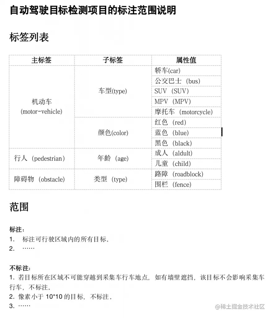 这份范围说明文档仅是临时模拟的一个参考样例,实际标注过程中,该文档应该更全面,比如对于标签的说明最好有配图从而让标注团队消除歧义,在标注范围和不标注范围中尽可能定义一切特殊情况。