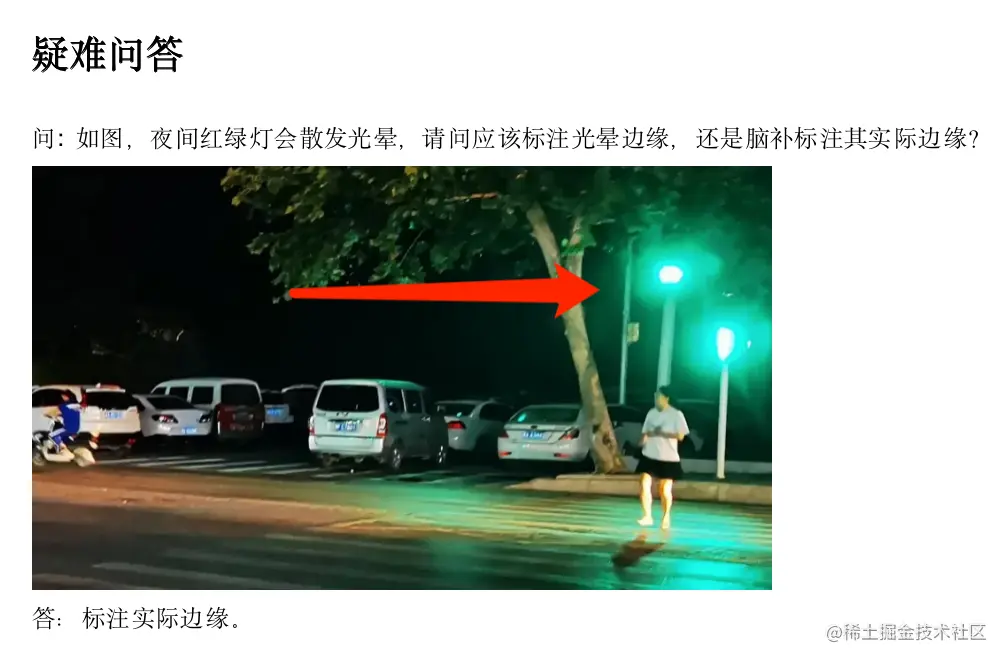 通过疑难问题文档以问答的形式收集标注过程中的所有特殊情况处理是必要的,这为标注团队节省了很多时间。很多时候,您的内部人员在测试标注时,已经发现了许多标注说明无法完全覆盖到的边界情况,虽然您可能已经在标注说明中提到了,但是疑难问题部分更适合口语化表达,问答的形式也有助于标注团队也能更好地理解其含义,这里是一份关于交通灯数据标注项目的模拟的疑难问题文档供您参考。