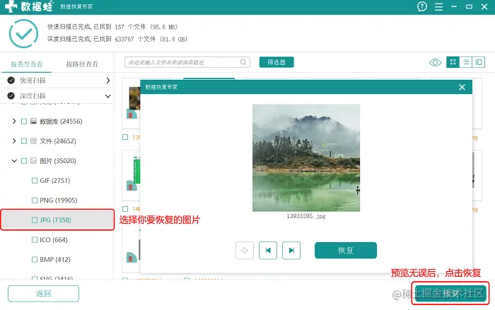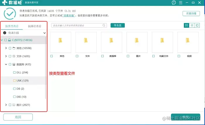 步骤2: 第一次快速扫描结束后,你就可以在页面左侧按【类型】来查看文件格式。如果找到或者找齐你要恢复的数据,就直接选择文件,点击【恢复】。