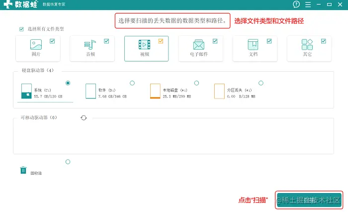 步骤1: 选择文件丢失的类型,这里的选项建议全选,可以扫描出来更多内容,使结果更全面。然后选择文件丢失的路径,根据你的实际情况来选择。最后,选择【扫描】来开始运行该软件。