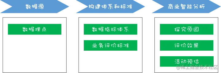 一般都是从数据分析师的日常工作内容出发来定义数据思维,即数据埋点、指标体系和标准构建以及 BI 分析,如下图所示。