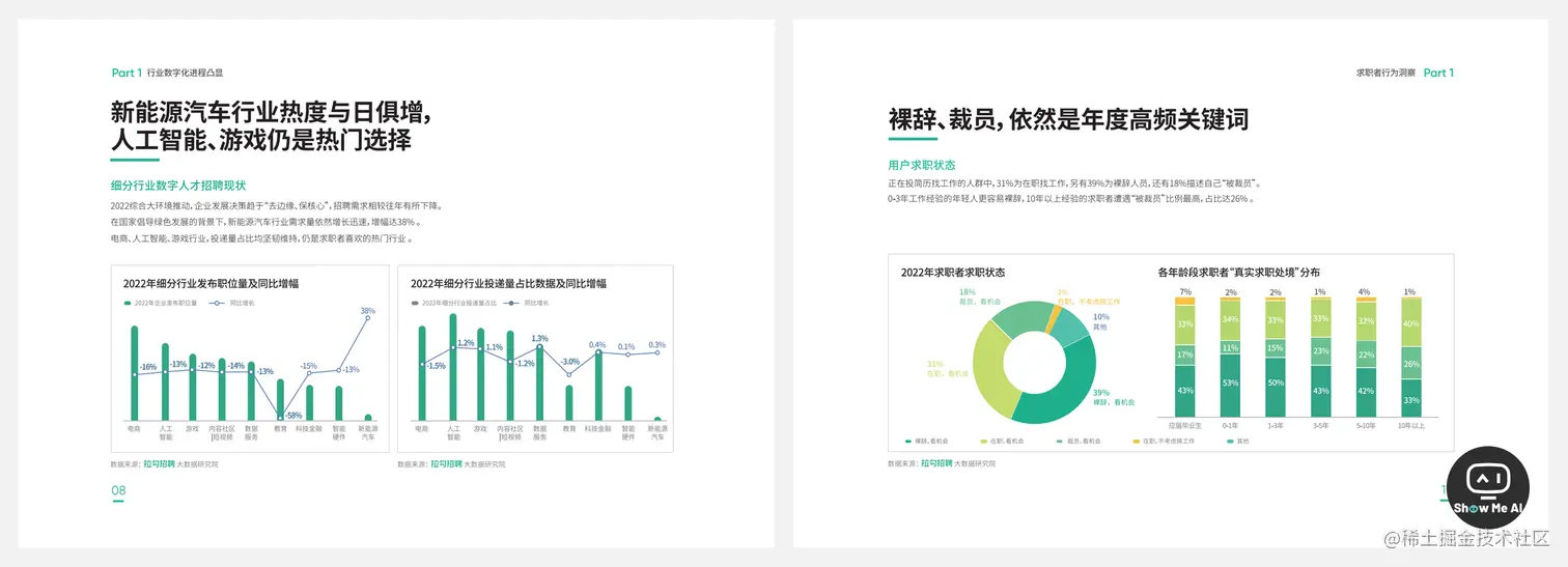 本周发布的白皮书定性定量地分析2022年“数字化科技人才招聘”的现状和职场生态,报告共89页,内容丰富,这里摘录一些关键结论(公众号“ShowMeAI研究中心”回复“E1”获取全本)。
