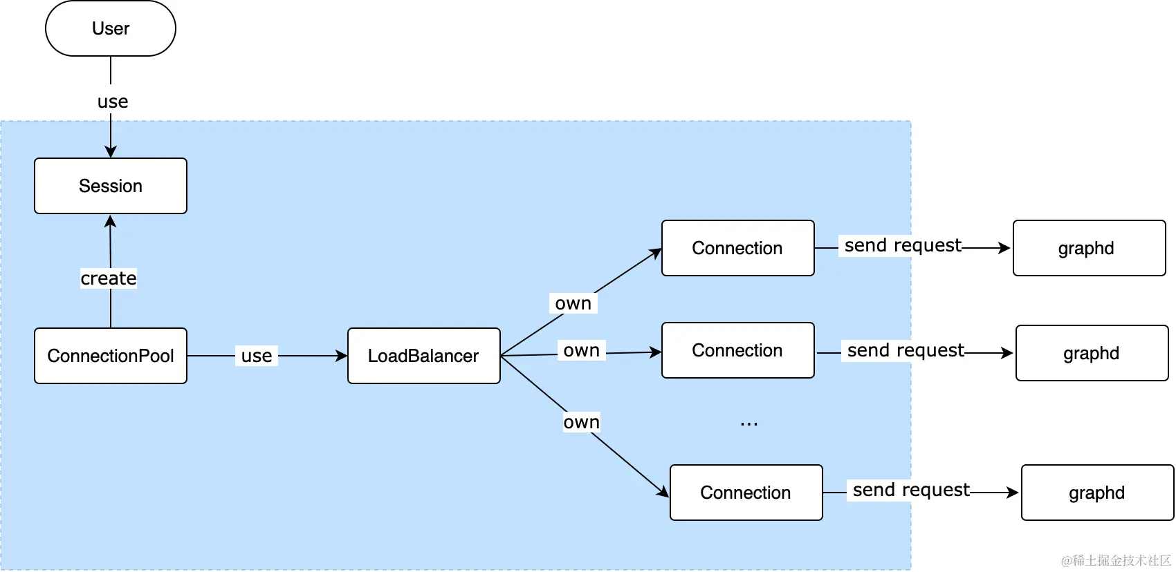 在连接池初始化阶段,用户使用 Session 之前需要先创建并初始化一个连接池 ConnectionPool,连接池会在初始化时会对用户指定的 NebulaGraph 服务所在地址建立连接 Connection。如果在用集群部署方式部署了多个 Graph 服务,连接池会采用轮询的策略来平衡负载,对每个地址建立近乎等量的连接。