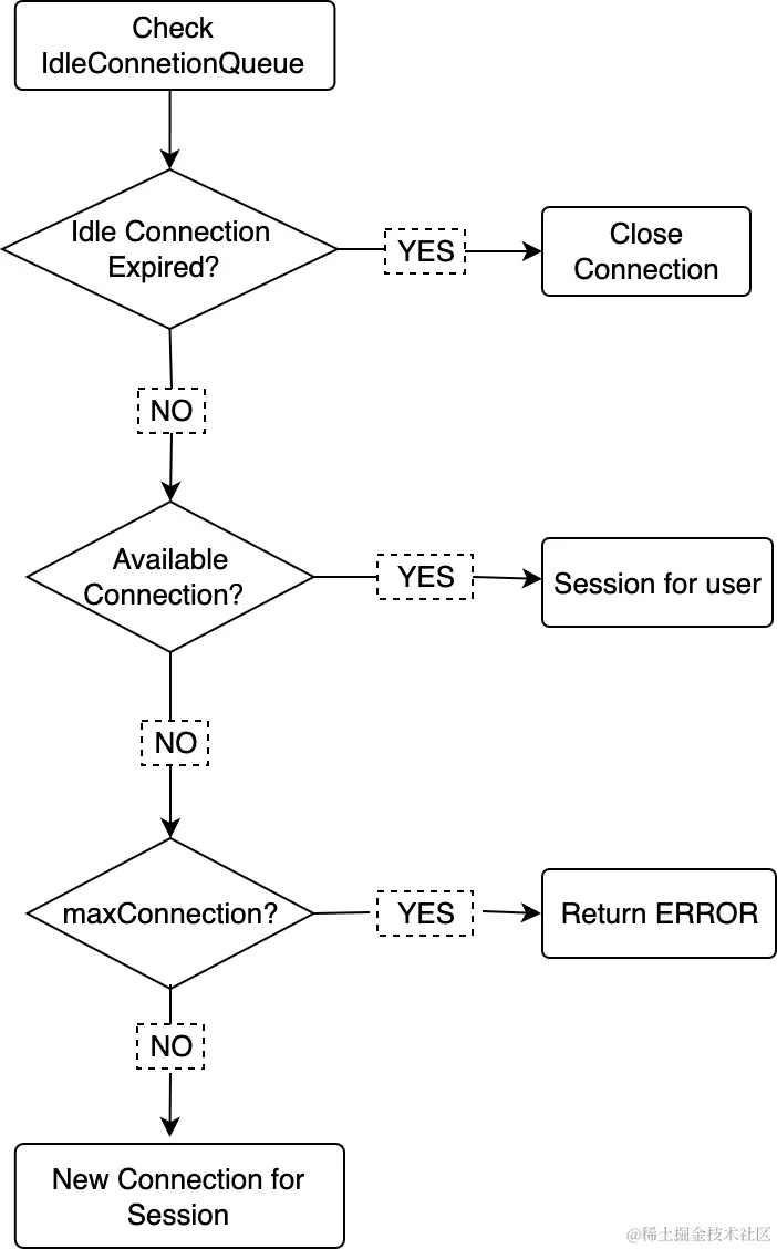 连接池如何管理连接 Connection 呢?连接池内维护了两个队列,空闲连接队列 idleConnectionQueue 和使用中的连接队列 activeConnectionQueue,连接池会定期检测过期空闲的连接并将其关闭。这两个队列在增删元素的时候会通过读写锁来确保多线程执行的正确性。当 Session 向连接池请求连接时,会检查空闲连接队列中是否有可用的连接,如果有则直接返回给 Session 供用户使用;如果没有可用连接并且当前的总连接数没有超过配置中限定的最大连接数 maxConnSize,则新建一个连接给 Session;如果已经到达了最大连接数的限制,返回错误。