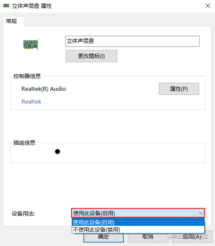 **步骤4:**点击下方的“设备用法”,选择“使用此设备(启用)”,接着点击“确定”即可打开电脑系统声音。