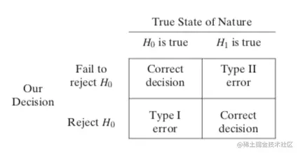 对比上图,第一类错误指的是原假设正确但是我们做出了拒绝原假设的结论,这个错误在现实中常常表现为“我作出了统计显著的结论但是我的改动实际上没用”;相应地,第二类错误指的是原假设错误但是我们没能拒绝原假设,这个错误在现实中常常表现为“我的改动有效,但实验没能检测出来”。