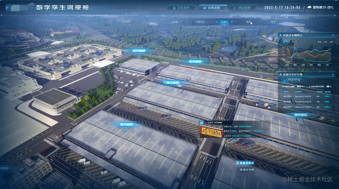 通过孪生场景对港区仓库、堆场进行实时库存、车辆管理,对货物的实时位置实现智能感知,对仓库、堆场存储率实现最优解。