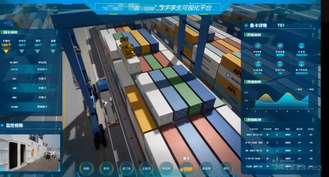 通过高精度定位设备,将港区内集卡车的定位信息、作业信息等数据及时回传至数字孪生港区平台,平台管理人员可通过孪生场景对集卡车辆进行管理,及时发现车辆作业异常信息,从港区全局维度调度作业资源,提升整体作业效率和吞吐能力。