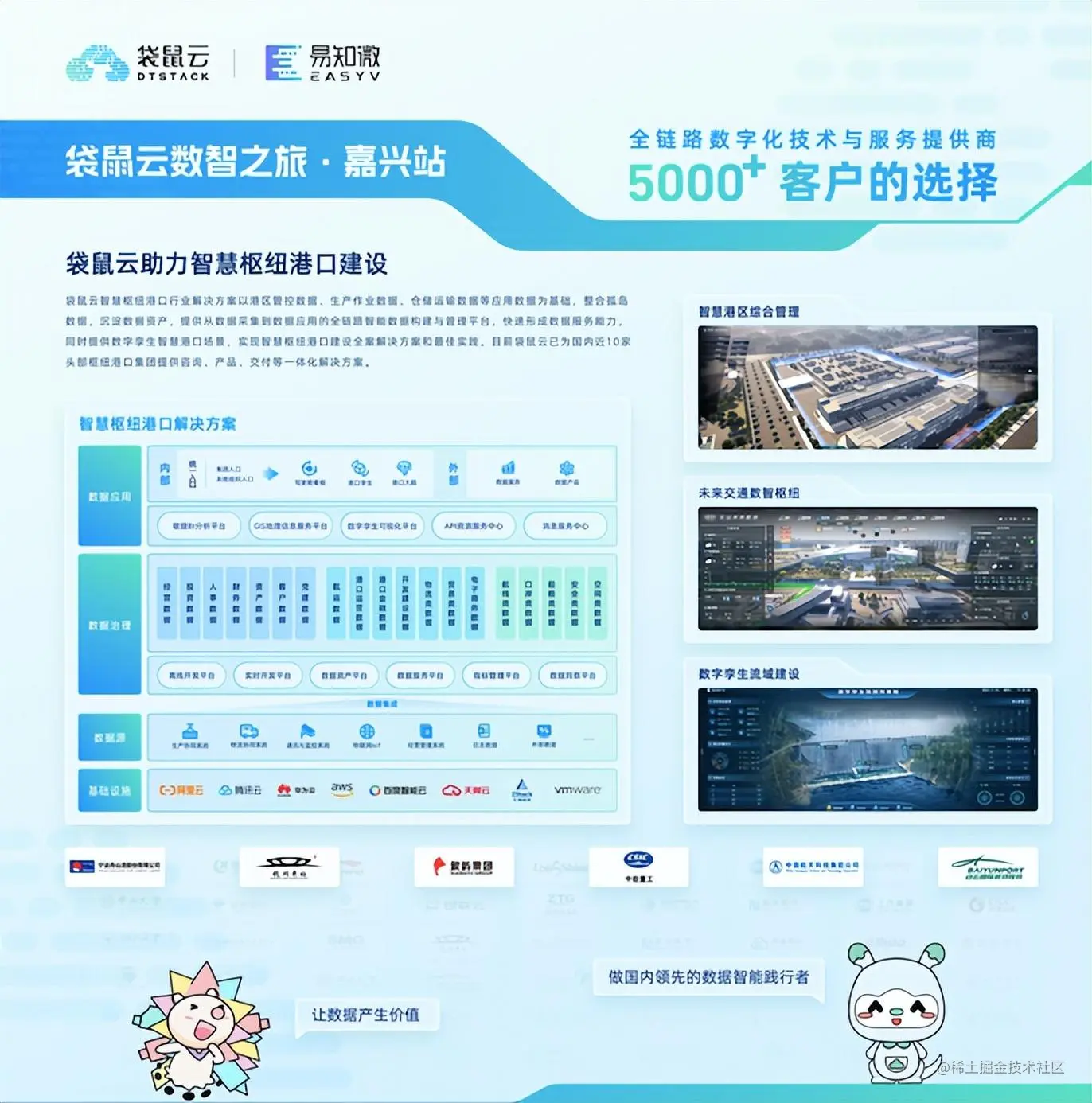 袋鼠云和易知微紧跟国家政策步伐,不断探索智慧港口建设新模式,助力港口实现数字化转型升级。目前已为国内近10家头部枢纽港口集团提供咨询、产品、交付等一体化解决方案。