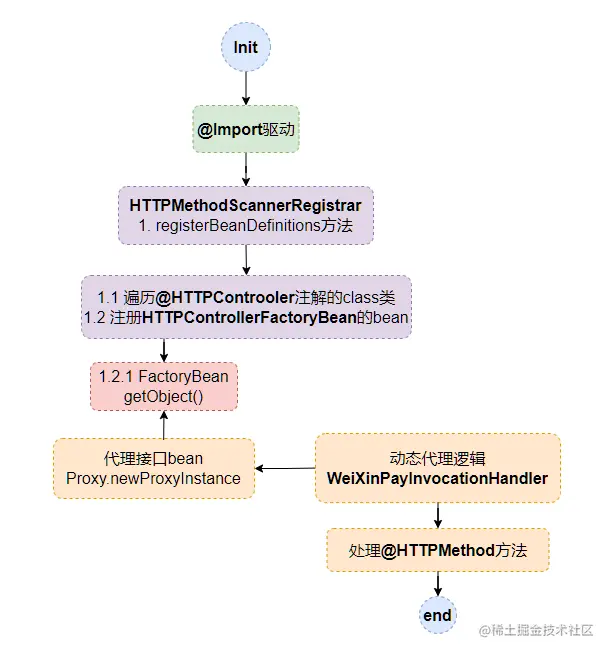 - 在Spring启动初始化时,通过@Import({HTTPMethodScannerRegistrar.class})来驱动ImportBeanDefinitionRegistrar接口的实现类进行定制化Bean的注册。
