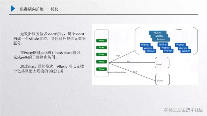 这个优化我们主要借鉴了Redis的实现方案,就是可以在底层对元数据进行分片,然后由多个cluster集群对外提供服务,这样做的一个好处就是对外可以提供一个整体,当然也可以采取不同的优化策略,比如多个集群完全由用户自己去掌控, 把不同的数据分配到每一个集群上,但这样对用户的使用压力就会比较大。先来介绍一下这个框架,首先我们把这个元数据进行一个分片,比如用户拿到的整体数据规模集合比较大,单集群放不下了,这时候会把大规模的数据集合进行一个分片,把元数据进行一些哈希(Hash)映射,把一定hash的值映射到其中某一个shard上,这样cluster这个小集群就只需要去缓存对应部分key对应的文件,这样就可以在集群上面有目标性的进行选择。