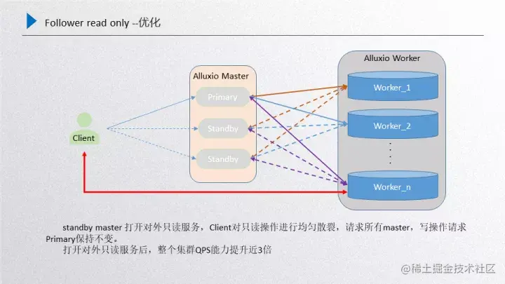 主要是针对前面进行的总结,所有的worker向所有的standby进行注册,这时候standby的数据和primary的数据基本上是一致的,另一部分还是primary和worker之间维护的主心跳,这个时候如果client端再发起只读请求的时候,就会随机散列到当前所有的master上由他们进行处理,处理完成之后返回client端,对于写的请求还是会发放到primary上去。然后在不打破raft一致性的前提下,又可以把只读的性能提升,这个机器扩展出来,按照正常推理来说,只读性能能够达到三倍以上的扩展,通过follower read实际测验下来效果也是比较明显的。这是我们引入Alluxio之后对性能的优化。