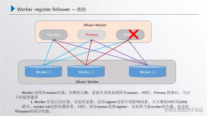这个时候如果primary被重启了,内部通过raft进行选举,选举出来的这个新的primary对外提供服务,primary的选举需要经历几部分:第一部分就是primary被重启之后,raft进行自发现,自发现之后两者之间进行重新选举,选举出来之后这个新的primary经过catch up后就可以对外提供服务了,就不需要重新去获取worker进行一个register,所以这就可以把时间完全节省下来,只需要三步:自发现、选举、catch up。