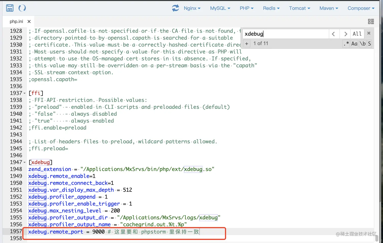 端口号要和 php.ini 中的保持一致,我这里默认就是这个样子,不用修改。