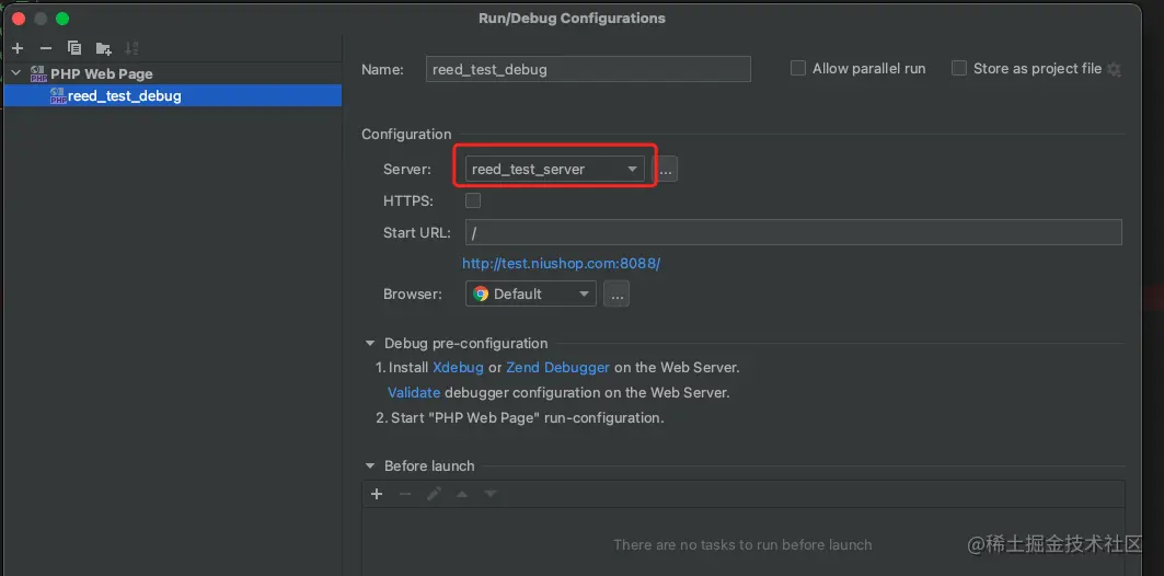 - 新增调试配置,进去之后新建一个 PHP Web Page,然后红框中选中我们刚刚新建的server。