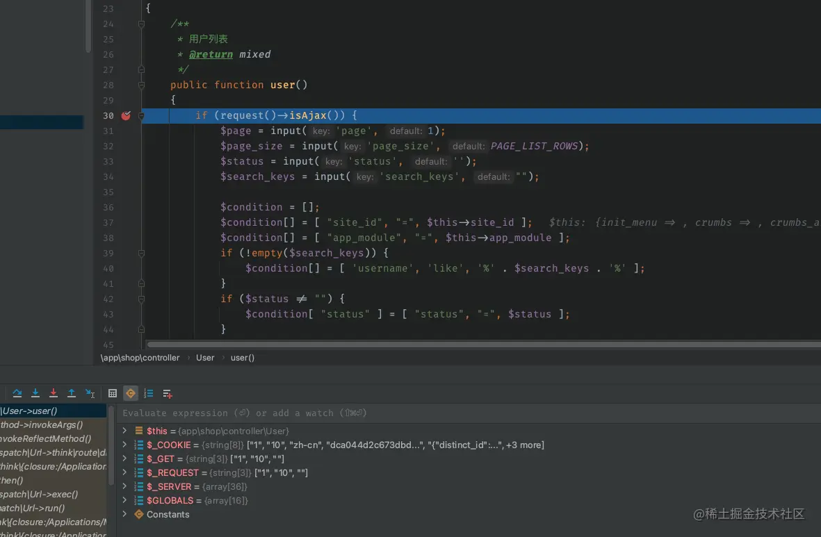 - 然后就配置完了,找段代码打个断点调试一下。这不比在代码里到处写dump强吗?