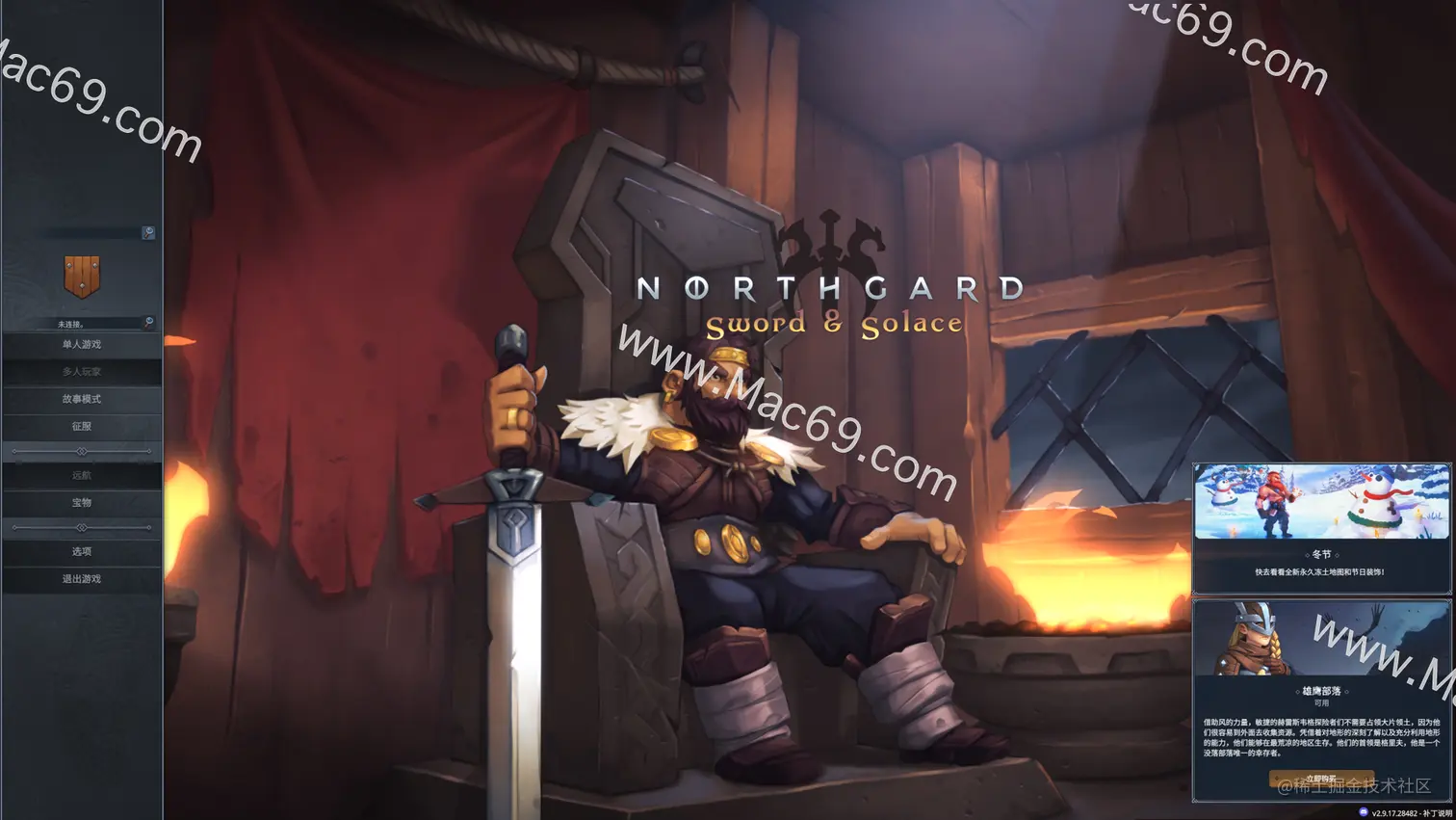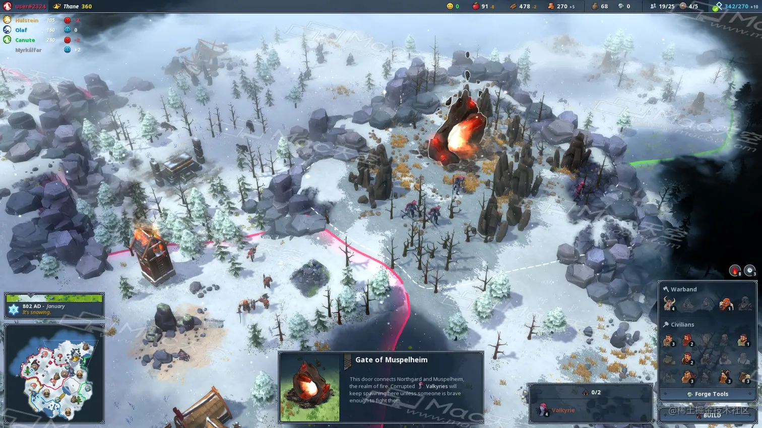 北加尔(Northgard) mac中文版是一款非常有趣的即时战略类游戏,游戏以北欧神话为背景,讲述了一群维京战士的冒险故事。玩家在游戏中将扮演领导者的身份,指挥战士收集资源,搭建房屋,探索遗迹,对抗猛兽和敌人,不断扩张你的部落。