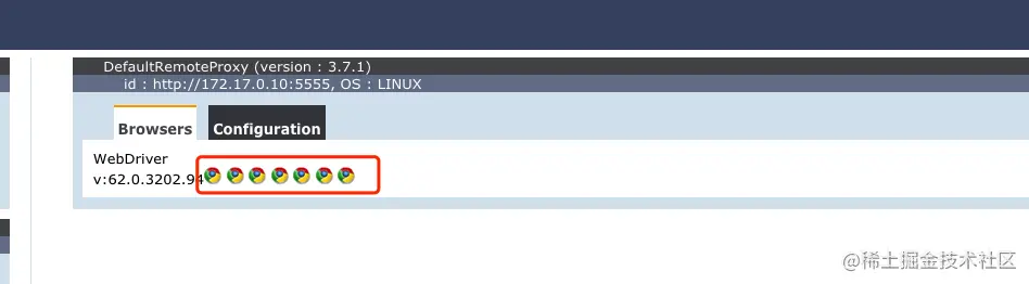 如果想在一个Node中启动多个浏览器,我们可以更改这两个字段的数量,比如我们将6修改为7NODE_MAX_INSTANCES=7;NODE_MAX_SESSION=7,这时候我们可以看到有7个谷歌浏览器的logo