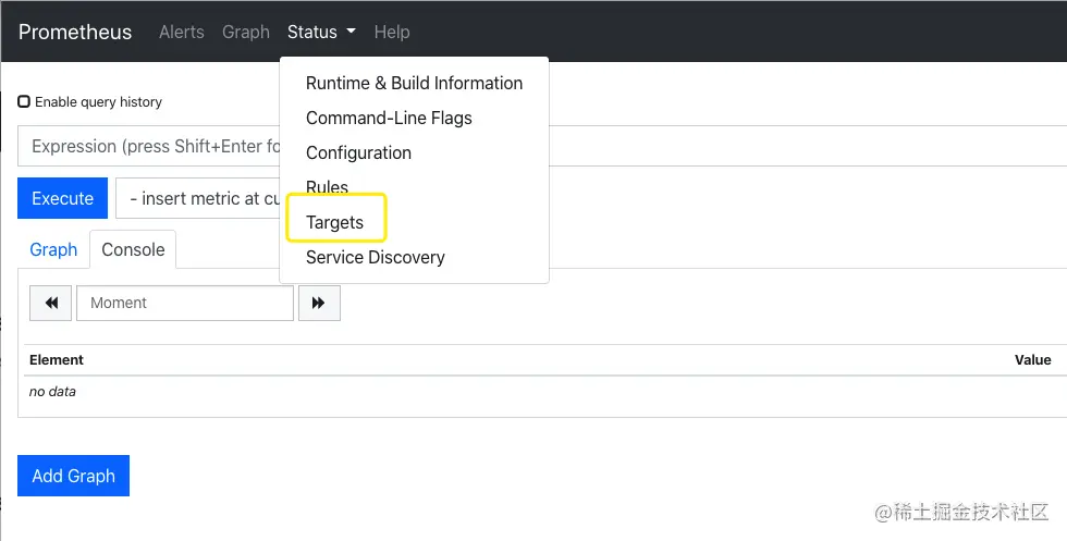 5.输入ip和端口号进入prometheus的前端界面,然后进入Targets页面