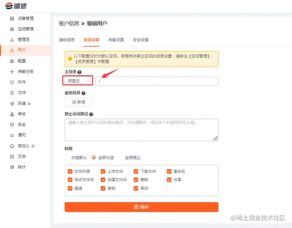 为用户设置刚才配置的阿里云存储,路径为阿里云的主目录路径。