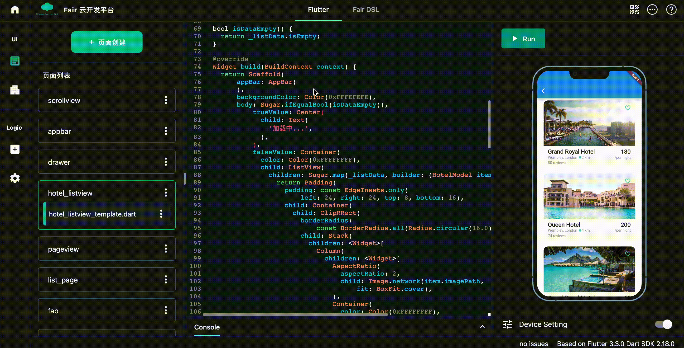 在我们使用Flutter 开发移动端应用时,借助Debug 模式下的Hot Reload 功能可以实现在手机或模拟器上面快速的预览代码改动。在传统的低代码平台上因为采用拖拽控件的方式天然的支持对UI 效果的把控,而Fair 云开发平台上面采用在线编写代码的方式,需要在网页中快速预览所写代码运行后的效果。