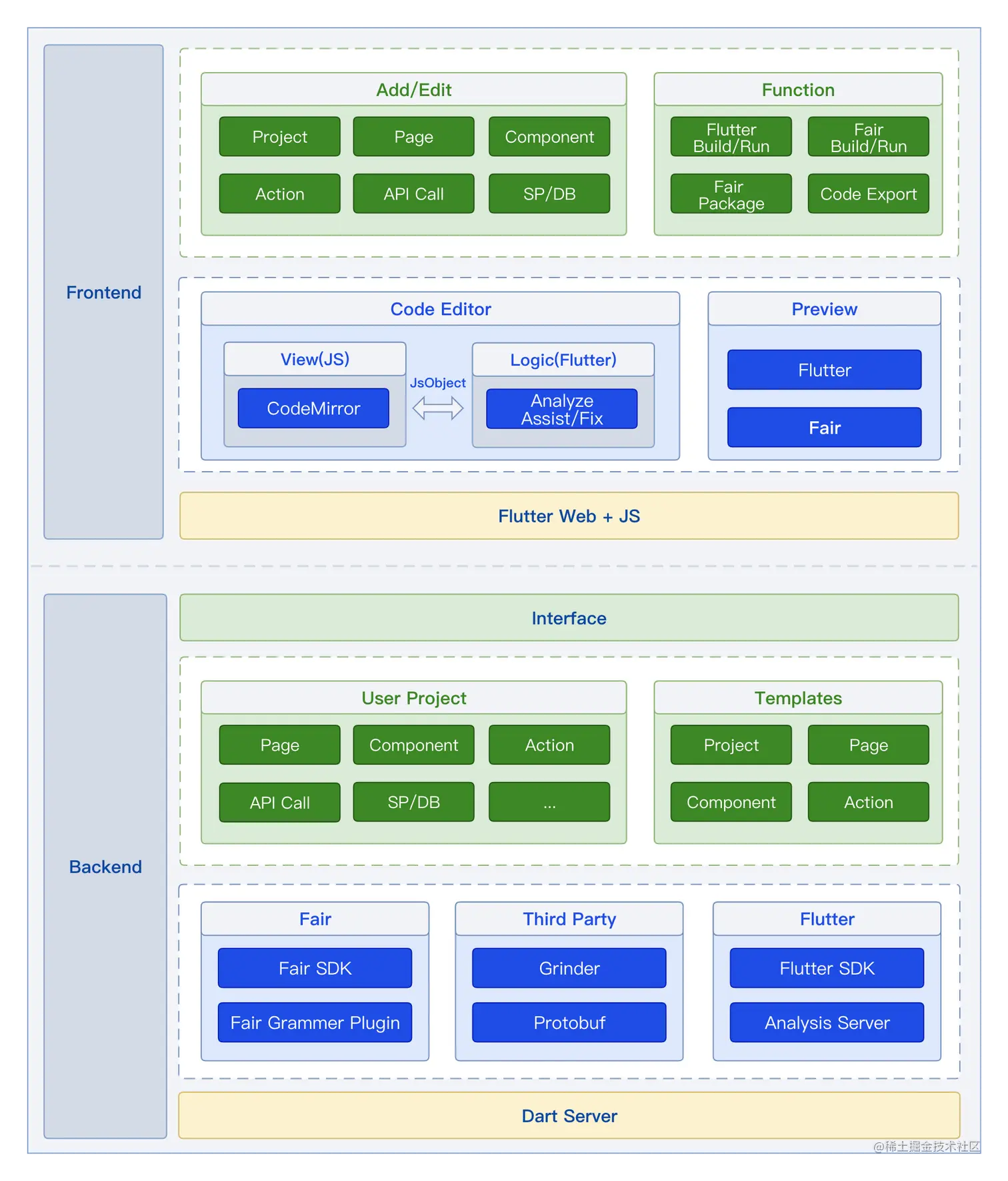 整体架构设计分为前后端,都基于Dart 技术栈实现。 上半部分是前端,应用展示层。技术栈使用的是Flutter Web + JS。