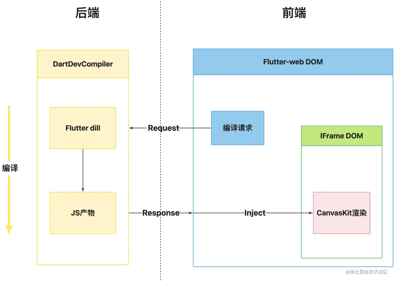 - 后端接收请求,通过dartdevc 编译器对工程代码进行编译,将生成的JS 产物返回给前端