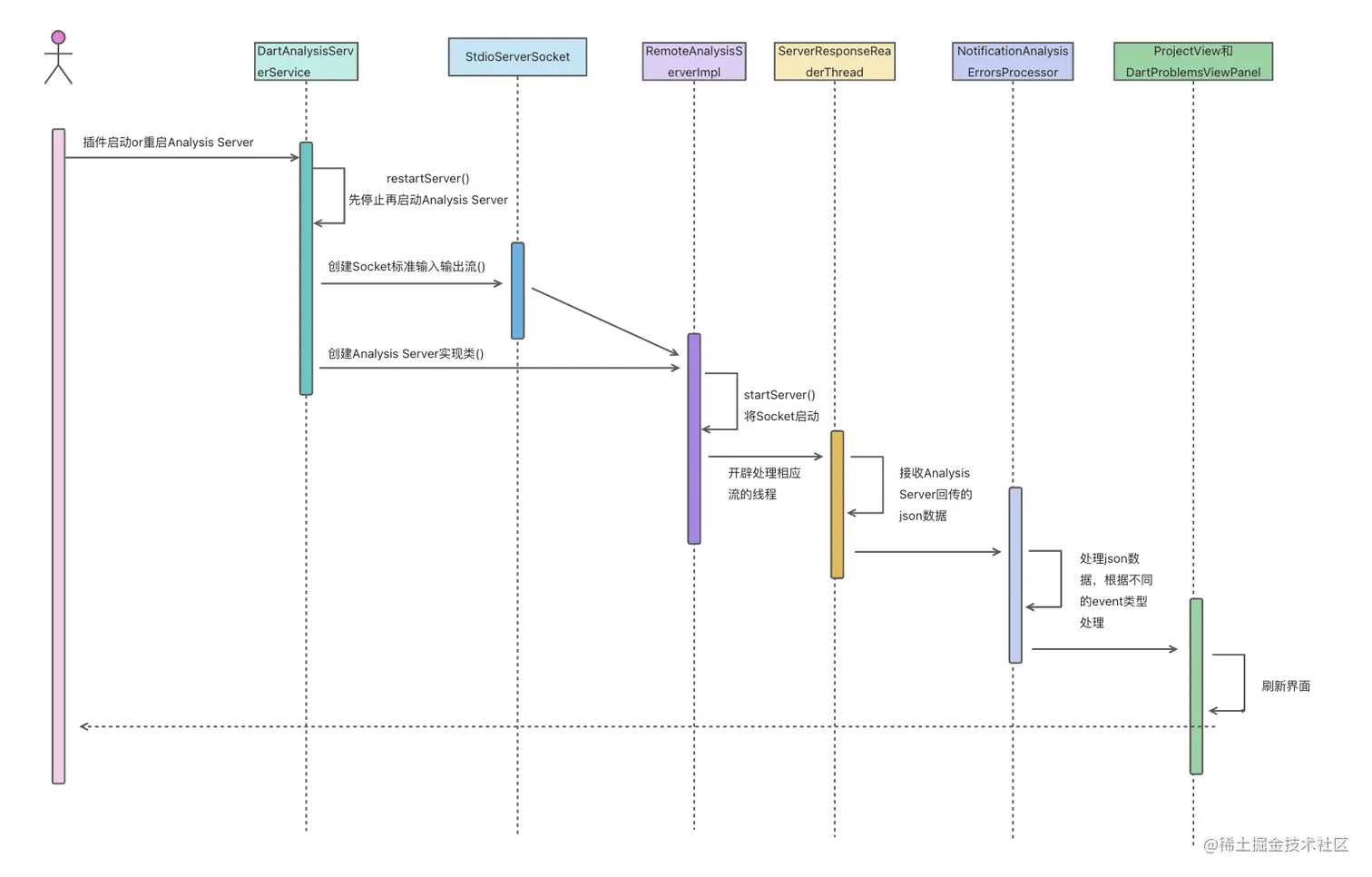 以Android Studio 为例,语法检测核心是Analysis Server,Dart 插件负责监听用户代码修改,每当代码有改动时,插件会通过Socket 同步给Analysis Server,Analysis Server 分析结束后将结果同步给Dart 插件,Dart插件根据Analysis Server 返回的事件类型进行处理,最终通知Android Studio 刷新界面。详细时序图如下: