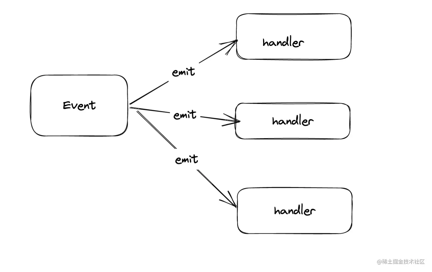 是一种一对多的模式,或者说多对多的模式;一个事件对应多个处理函数,多个事件对应各自对应的处理函数
