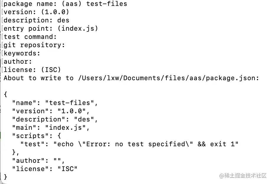 第一步、npm init ,根据提示,完成一些参数的选择。如图,我们可以先一路回车,选择默认值,之后到项目的package.json里面去修改。