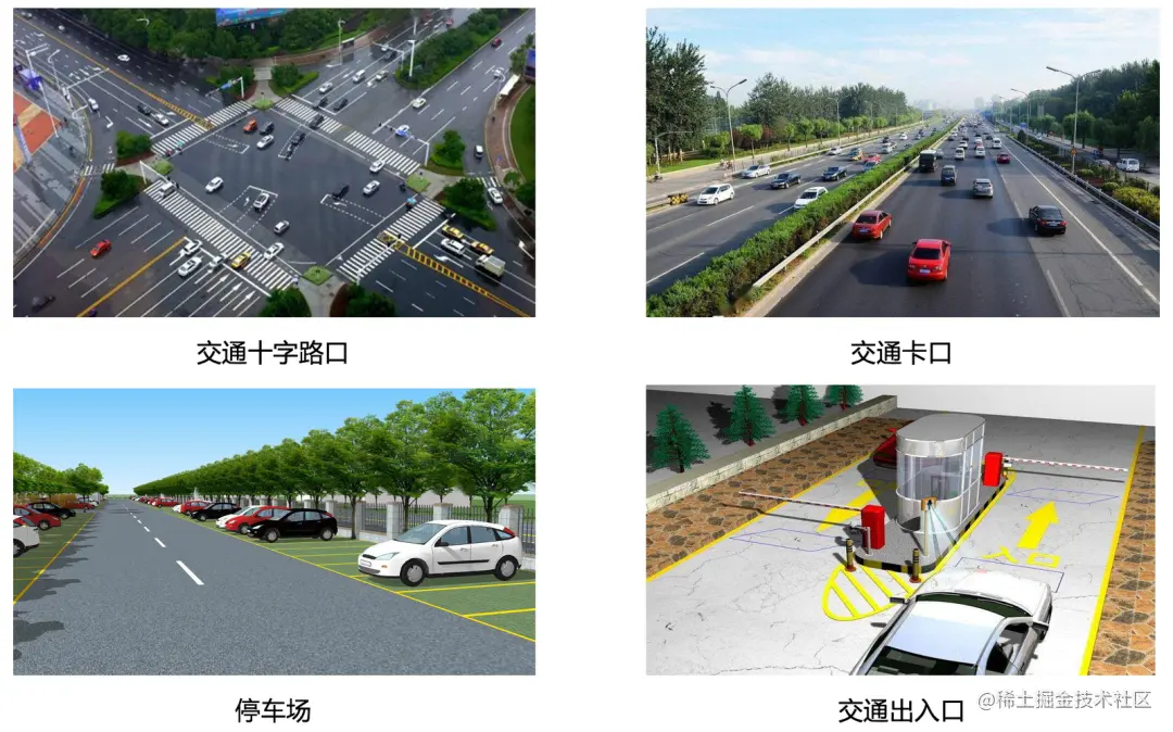 智慧交通的应用场景主要划分为:十字路口、交通卡口、交通出入口、停车场等。