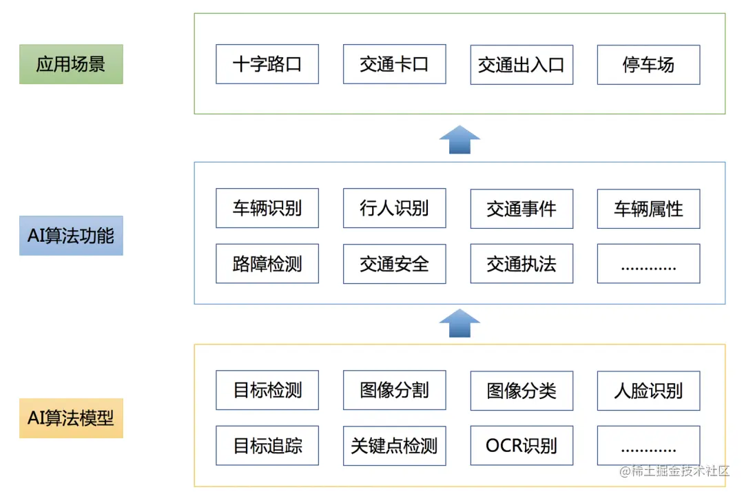 在智慧交通的的场景中,每个场景都对应了不同的算法业务功能,每个算法业务功能则是由不同应用技术如目标检测、图像分割、图像分类、目标追踪、OCR识别等组合而成。