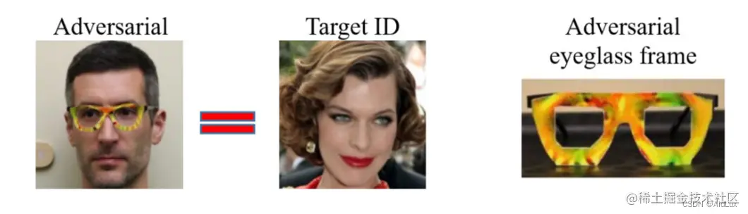 比如使用对抗眼镜攻击让人脸识别系统失效,攻击者戴上一个精心制作的对抗眼镜,使得人脸系统对人脸ID出现了误判,对人脸识别系统整体性能产生较大影响。