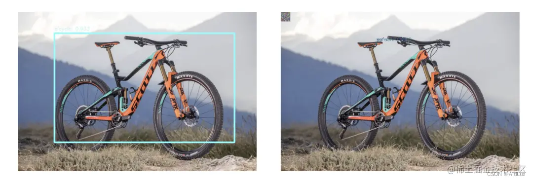 再比如对交通工具进行对抗攻击,在图片左上角添加一个对抗噪声,其并不会破坏交通工具本身的主要特征,但是却能使得使得检测模型对自行车产生了漏检,而重要交通工具的漏检可能引发严重的交通连锁后果。