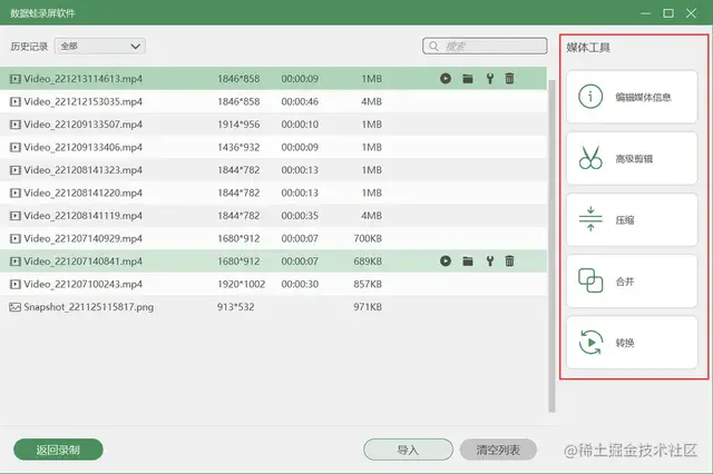 **步骤5:**停止电脑录屏后,可以观看“预览窗口”录屏的视频;确认无误后,按下“完成”按钮,将自动帮您保存;如需查看录制记录,可以在自动转到的“历史记录”中查看;并且可以选择右侧的“媒体工具”对视频合并、压缩、转换等后期操作;