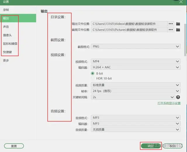 **步骤2:**软件安装好并将该软件打开,如有更改电脑录屏参数的想法,可以点击“设置”对“帧率”、“视频画质”、“视频输出格式”、“摄像头设置”、“音频设置”等进行调整;