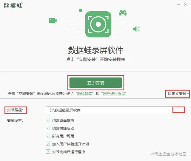 **步骤1:**在网页上直接获取“数据蛙录屏软件”的安装包,软件有Windows和Mac版本,自动适配您的电脑系统。安装包后,通过自定义安装程序路径,推荐将软件安装在电脑D盘。