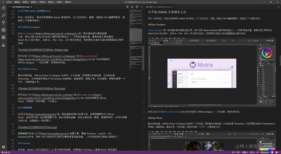 人生苦短,我用 VS Code 完成关于文本编辑工作的一切。它天生支持几乎所有编程语言,还可以通过扩展个性化相应的语法高亮等。由于我通常在 Mac 上写文章,VS Code 还是我在 Windows 上临时编辑 Markdown 文件的首选。